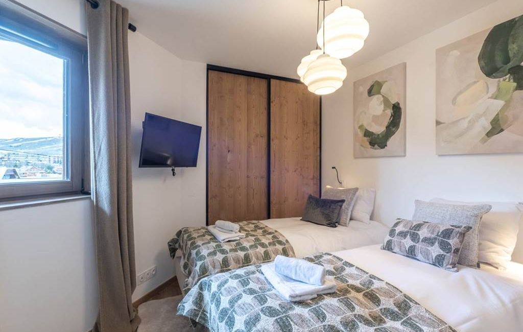 Alpe d'Huez Houses vous accueille dans ce magnifique appartement 2 chambres, en duplex, traversant, avec un salon cathédrale côté terrasse Sud Ouest.
