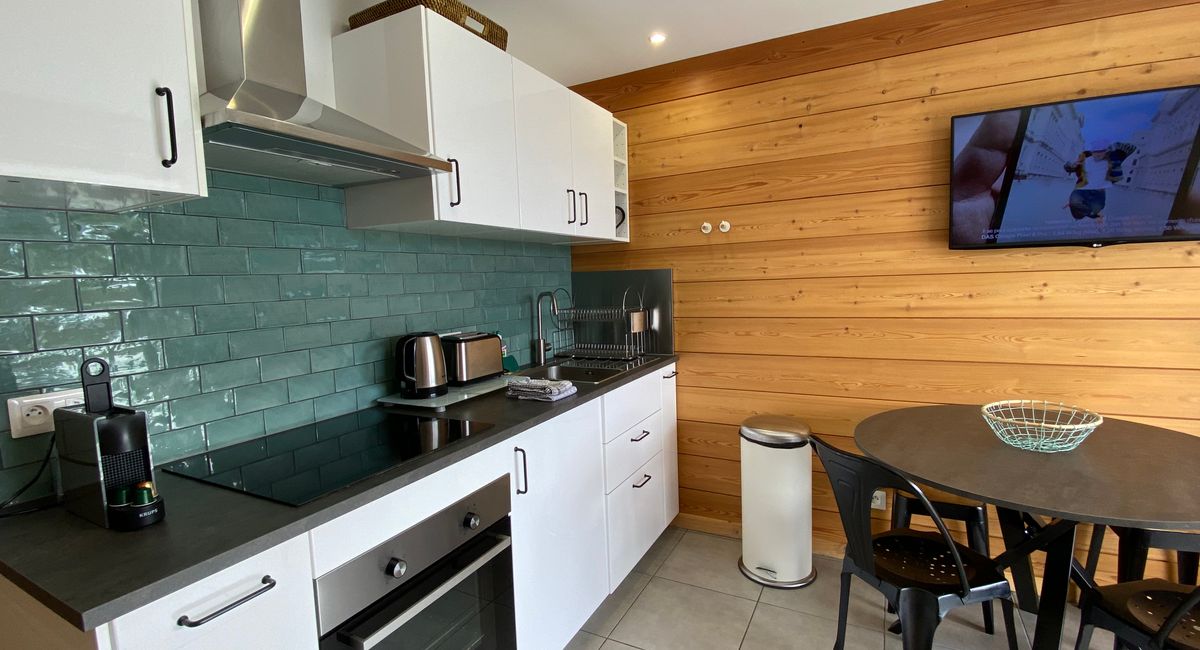 Il comprend 2 chambres, une salle de douche et WC, une cuisine bien équipée ouverte sur le séjour. Idéal pour une famille de 4 et 4 amis (les lits superposés mesurent 190 cm de long et la couchette du haut ne peut pas accueillir quelqu'un de plus de 60 kg).