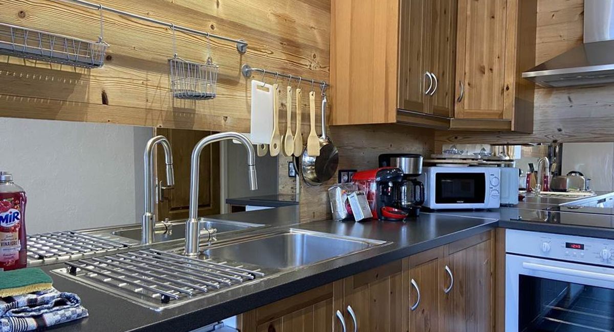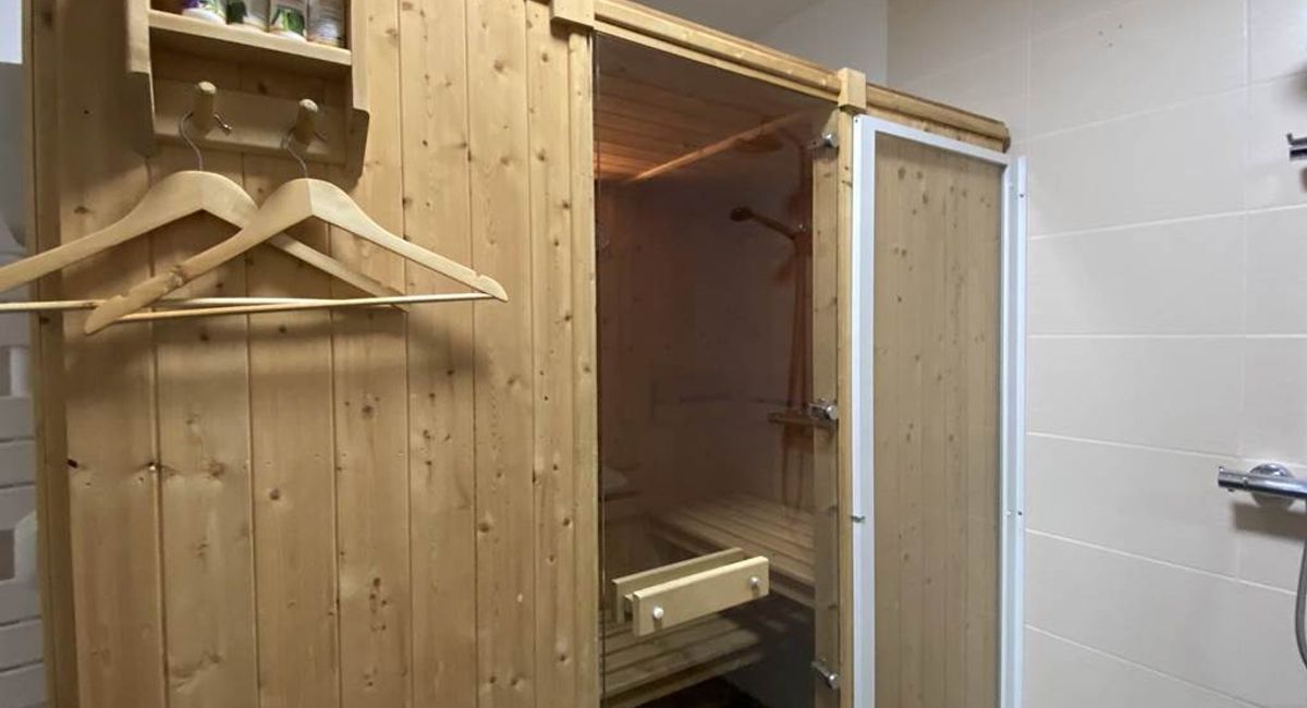 Grand appartement pour 12 personnes avec cuisine toute équipée ouverte sur séjour et salon, 6 chambres dont 2 avec lit double , 2 avec 2 lits simples et 2 avec 2 lits superposés, un local à skis à l’entrée avec porte-skis et chauffe-chaussures, une grande terrasse équipée de tables, 2 salles de bains avec douche , un sauna , 3 WC, une buanderie.