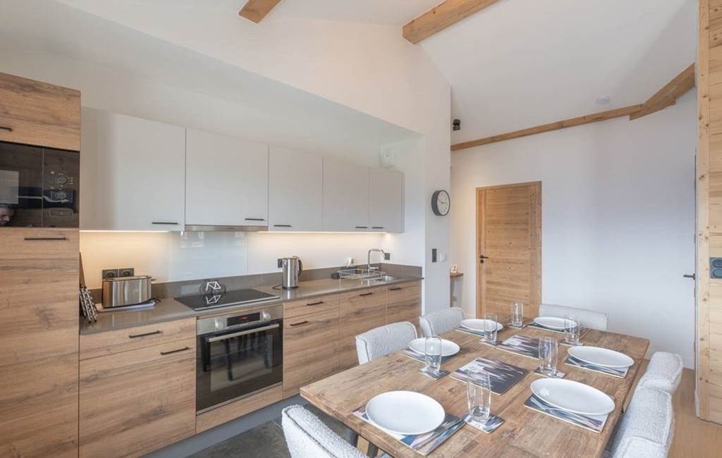La cuisine est très bien équipée, avec four, micro onde, plaque induction 4 feux, grand frigo, espace congélateur, verres à vin et vaisselle suffisante pour 6 à 8 personnes, et une décoration soignée dans tout l'appartement.