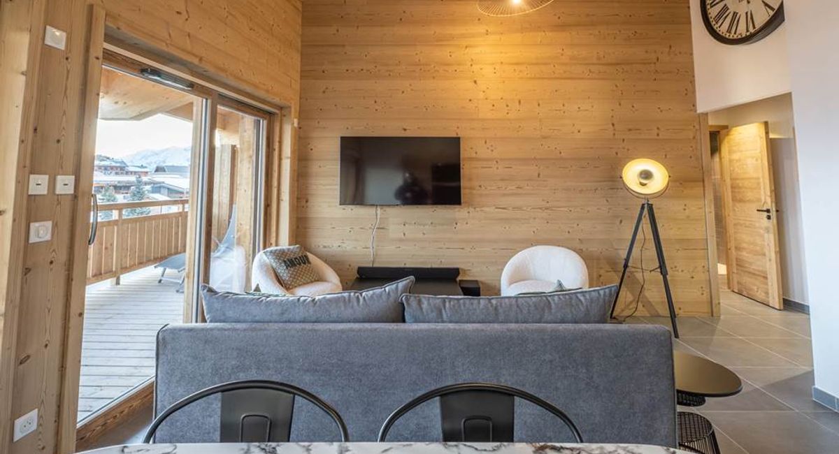 La pièce de vie est baignée de lumière car la grande terrasse la longe intégratement.