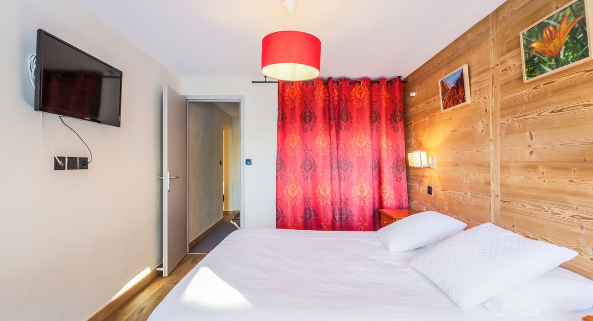 Chambre 4 : 2 lits simples superposés, TV et son coin montagne avec 1 lit