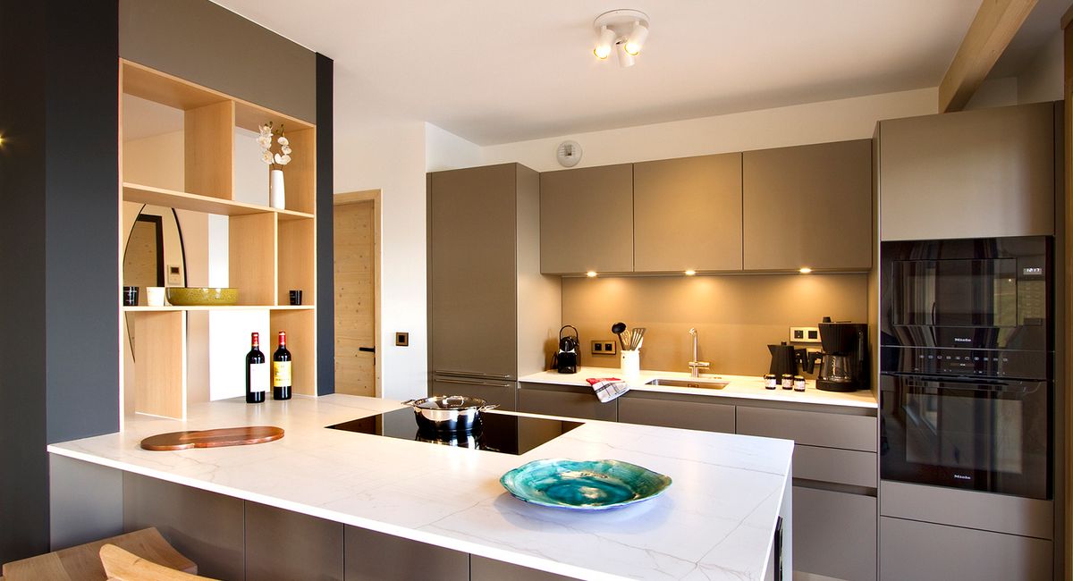 Une grande cuisine entièrement équipée avec four, four micro-onde, lave-vaisselle, cafetière expresso, cafetière philtre, bouilloire, grille-pain, mixer. Un espace repas.