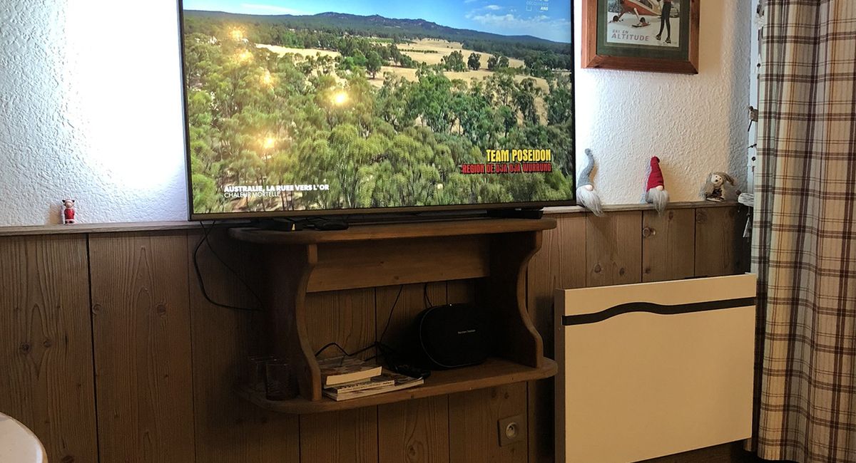 Séjour : canapé sofa convertible, enceinte bluetooth, TV écran plat