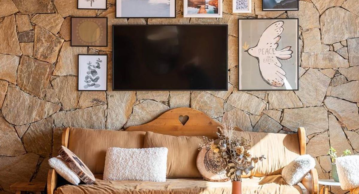 Salon cathédrale donnant accès sur une terrasse de 35m2 – vue sur les écrins – orientation Sud Ouest: le salon est équipé de deux larges canapés, et d’un téléviseur écran plat.