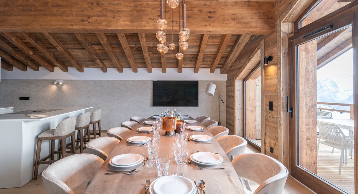 La belle pièce de vie, cuisine ouverte avec îlot central et le coin repas sont ouverts sur des baies vitrées Sud Ouest et une magnifique vue montagne et station.