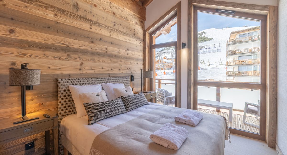 Ce bien de grand standing accueille 12 personnes confortablement dans un décor de montagne moderne, sous la charpente bois de cette résidence.